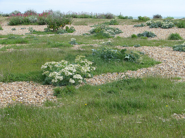 Other plants on the shingle bar include the beautifully architectural rock samphire (Crithmum maritimum) and the giant leaved sea kale (Crambe maritima), the latter becoming popularised through its abundance in Derek Jarman’s extraordinary shingle garden near Dungeness. Sea kale taproots reach depths of up to 2 metres, providing them with a significant anchor in coastal winds.